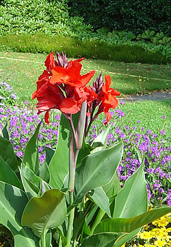 Für das Vorziehen von Canna-Knollen ist ein Topf mit einem Durchmesser von ca. 25 cm ideal. Die Knollen werden in frische Kübelpflanzenerde gesteckt, und zwar etwa so tief wie die Rhizome hoch sind. Der Topf kommt danach an einen hellen, warmen Platz in der Wohnung. Wenn nach rund 3 Wochen die ersten Triebe aus der Erde gucken, kann mit dem Giessen angefangen werden. Ab ca. Mitte Mai, wenn keine Fröste mehr zu erwarten sind, können die Pflanzen ins Freie ̶ in die Rabatte oder auch in einen grossen Kübel oder Pflanzentrog.Die schnell wachsenden Cannas benötigen einen sonnigen und windgeschützten Platz, regelmässige Wassergaben sowie reichlich Dünger, am besten einen Blühpflanzendünger in flüssiger Form. Gibt man ihnen was sie benötigen, blühen diese imposanten Sommerblumen bis zu den ersten Frösten im Herbst.