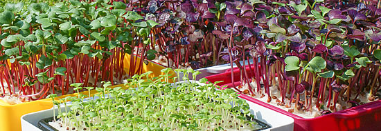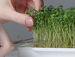 - RadiesCress: Die würzig-frischen Radieschen-Keimlinge sehen mit ihrer dunkelvioletten Farbe äusserst dekorativ aus. Geniessen kann man sie kalt oder warm. Beim Erwärmen büssen sie jedoch etwas an Schärfe ein. Zu Salaten, Dips oder Suppen stellen sie eine ideale Ergänzung dar.