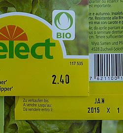 Die Samentüten von „Select“ sind ansprechend, mit vielen Informationen. Naturgetreue Abbildungen, exakte Bezeichnungen und Kulturtipps erleichtern die Wahl. Besonders zentral für die Qualitätssicherung ist der kleine, rückseitige Aufdruck unten: Der Code (Buchstabe und Zahl wie z. B. X1) neben dem Verbrauchsdatum, bis zu dem eine optimale Keimung erhalten bleibt, kennzeichnet die Abfüllpartie. Der Aufdruck erfolgt während der Abfüllung. Anhand dieses Codes können wir die Vorgeschichte des Samens in dieser Tüte zurückverfolgen. Die ganze Verarbeitungskette ist dokumentiert, denn die Wyss Samen und Pflanzen AG ist ein ISO 9001 zertifiziertes und Bio Suisse auditiertes Unternehmen.Samen leben. Deshalb sind abgefüllte Samentüten bis zum Verbrauch zeitlich eng limitiert. Nichts desto trotz erfolgen an zurückgestellten Tüten im Folgejahr – vor Beginn der neuen Gartensaison – Keimprüfungen. Sollte einmal die Keimfähigkeit des Saatgutes nicht mehr den Qualitätsanforderungen entsprechen, würden die Tüten aus allen Verkaufsstellen zurückgezogen: Der kleine, unscheinbare Code unten auf der Rückseite macht‘s möglich, dass diese Abfüllpartie überall eruiert und aussortiert werden kann. Eigentlich müssig, zu sagen, dass es keine „Restpostenlager“ gibt, denn an Lager und im Verkaufsangebot sind ausschliesslich Produkte, die bei korrekter Anwendung zum blühenden und ertragreichen Erfolg führen.