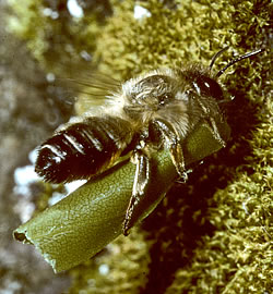 Aus Laub-, manchmal sogar aus Blütenblättern, schneiden Blattschneiderbienen rundliche Stücke aus und bauen damit ihre Nester in Baumlöcher, Mauerspalten, Erdhöhlen und andere Hohlräume. Hin und wieder graben sie ihre Nester selbst in markhaltige Stängel, Totholz oder in den Boden und verkleben mit dem ausgeschnittenen Material die Zwischenwände und verschliessen ihre Nester. Die Brutzellen werden mit abgeschnittenen Blattstücken verschiedener Laubbäume, Sträucher oder Kräuter tapeziert. In jede Zelle werden ein Pollenvorrat und ein Ei gelegt, und die Zelle wird dann mit weiteren Blattstücken verschlossen. Die entwickelten Larven spinnen in ihrer Zelle einen Kokon und überwintern dort.Bevorzugte Pflanzen: Lavendel (Lavandula), Blasenstrauch (Colutea), Salbei (Salvia), Glockenblume (Campanula).