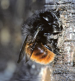 Sie ist eine der auffälligsten Wildbienen, die man im Frühling beobachten kann. Das Weibchen mit dem pechschwarzen Körper und dem rostroten pelzigen Hinterleib ähnelt einer Hummel. Das etwas kleinere Männchen ist an seiner weissen Gesichtsbehaarung zu erkennen. Lediglich die Weibchen haben am Vorderkopf zwei kleine Hörnchen, die zwischen den Haaren versteckt sind. Diese Wildbienen-Art mag einen milden und blumenreichen Frühling. Sie ist daher praktisch nur in besiedelten Gebieten anzutreffen, wo das Kleinklima und das meist reiche Angebot an früh blühenden Pflanzen ihren Bedürfnissen gerecht wird.Bevorzugte Pflanzen: Kern- und Steinobst sowie Frühlingsblüher wie Krokus (Crocus), Hyazinthe (Hyacinthus), Blausternchen (Scilla).