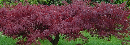 Laub: tief eingeschnitten; dunkelrot, leuchtend rote Herbstfärbung