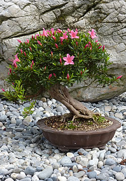 Was genau ist eigentlich ein Bonsai?Bonsai bedeutet dem Wort nach: Baum in der Schale. Es kommt aus dem Japanischen: bon = Schale, sai = Pflanze. Bei Bonsai handelt sich um eine asiatische Gartenkunst, bei der Gehölze durch Schnitt und Pflege so gestaltet werden, dass sie in eine Schale eingepflanzt werden können. Bonsais werden aber nicht nur in Schalen gepflegt. Sehr natürlich wirkt beispielsweise eine Kiefer, die in einen Naturstein gepflanzt ist. Um die Bäume klein zu halten, werden die Wurzeln geschnitten, damit die Kraft in die Äste und den Stamm geht. Mit dem Drahten der Äste bekommt der Baum Form. Diese Kunst stammt ursprünglich aus China, wurde jedoch von den Japanern weiterentwickelt und perfektioniert.