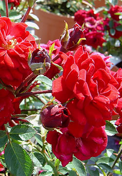 Merkmale: Diese klein bleibenden Rosen wachsen breitbuschig bis locker aufrecht und erreichen eine Höhe von 30 – 40 cm. Sie sind sehr gut zur Gefässbepflanzung oder Grabbepflanzung geeignet; können auch im Garten gedeihen, aber nicht neben stark wachsenden Pflanzen. Ihre zahlreichen meist in Büscheln stehenden Blüten erscheinen von Juni bis Oktober.Tipps: Gefässe sollten eine Grösse von mindestens 40 cm Durchmesser haben, damit die Wurzeln im Winter ausreichend geschützt sind.