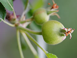Ausdünnen: Um grosse aromatische Äpfel zu bekommen, sollte man nicht immer alle Früchte am Baum belassen. 1 – 2 Äpfel an einem Büschel sind genug. Da sollte es einen nicht reuen, auch wenn man den Baum neu gekauft hat und sich besonders auf die ersten reifen Früchte freut. Es empfiehlt sich, maximal 10 – 12 Früchte pro Meter zu belassen. Die überzähligen Früchte bis spätestens Anfang Juni entfernen.Sommerschnitt: Längere Seitentriebe, sogenannte Ausreisser, schneidet man Ende Juni auf ca. 10 – 15 cm zurück. Zu hoch werdende Bäume kann man etwas einkürzen, indem man den diesjährigen neuen Trieb kurz über dem Ende des letztjährigen Triebabschnitts abschneidet. Auch kranke und abgestorbene Triebe werden entfernt.