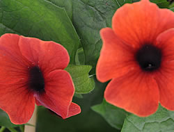 An dieser rankenden, schlingenden oder auch hängenden einjährigen Pflanze wachsen tief rostrote Blüten mit schwarzem Auge. Sie ist eine Bereicherung zu den bekannten Sorten in Weiss, Gelb oder Orange. Die Thunbergie mag einen sonnigen Platz und will regelmässig gegossen und gedüngt werden. So blüht sie vom späten Frühjahr bis in den Oktober hinein. Wenn wir die Schwarzäugige Susanne in einen Kübel pflanzen, benötigt sie eine Kletterhilfe. Sie macht sich aber auch sehr gut als Ampelpflanze.