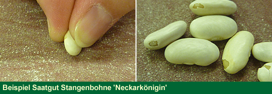 Beim Saatgut der Stangenbohne (Phaseolus vulgaris var. vulgaris) ‘Neckarkönigin‘ sowie der Buschbohne (Phaseolus vulgaris var. nanus) ‘Daisy‘ ist es ideal, dieses vor der Aussaat mit Schleifpapier leicht anzurauen. So kann es die zur Keimung nötige Feuchtigkeit besser aufnehmen.