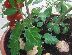 Zuallererst: Solche Pflanzen gibt es tatsächlich, und sie finden allmählich den Weg in die Schweizer Gartencenter. Bei den Pflanzen, die Kartoffeln und Tomaten tragen, handelt es sich weder um Zauberei noch um Produkte der Gentechnologie. Solche Pflanzen sind von Hand aufgepfropft (veredelt) worden so wie man es beispielsweise bei Apfelbäumen kennt. Tomaten und Kartoffeln gehören beide zur Familie der Nachtschattengewächse (botanisch Solanaceae) und lassen sich daher gut miteinander veredeln.