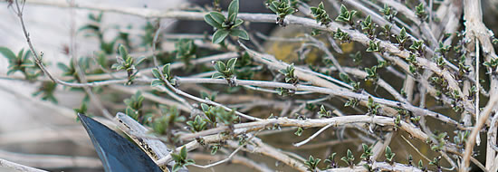 Verholzende Kräuter wie Bohnenkraut, Lavendel, Rosmarin, Salbei, Thymian, Currykraut oder Gewürzlorbeer können jetzt zurückgeschnitten werden. So können sie aus dem alten Holz wieder neu austreiben und buschig heranwachsen. Bodeneben abgeschnitten werden Minze, Oregano oder Schnittlauch.