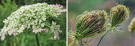 Eine besondere Eigenschaft macht die Wilde Möhre optisch äusserst attraktiv: Die Dolde rollt sich sowohl vor der Blüte wie auch zur Fruchtreife vogelnestartig zusammen. Im blühenden Zustand und auch später, wenn die Samen voll ausgereift sind, stehen die Dolden gespreizt. In jedem der vier Zustände sieht die Wilde Möhre sehr dekorativ aus.