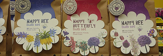Interessant sind die sogenannten Happy Bee und Happy Butterfly Mischungen. Jede Kollektion enthält 65 Blumenzwiebeln in 5 verschiedenen Sorten mit unterschiedlicher Blütezeit.