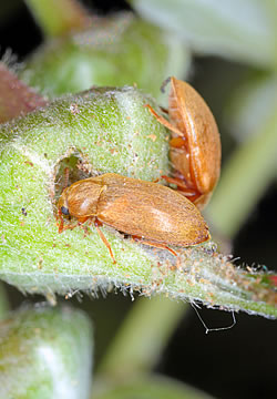 Frassspuren an Knospen und Blüten deuten auf die Aktivität des Himbeerkäfers, der zur Familie der Blütenfresser gehört, hin. Die Larven des kleinen braunen Käfers (sogenannte Himbeermaden) fressen im Innern der Früchte. Gegen sie muss vor dem Aufbrechen der Blütenknospen vorgegangen werden. Die Anwendung eines biologischen Insektizids (z. B. NeemAzal®-T/S gegen fressende und saugende Schädlinge) ist eine Möglichkeit. Zur Vorbeugung/Eindämmung kann unter den Himbeersträuchern eine Folie auf dem Boden ausgelegt werden. Damit wird verhindert, dass sich herabfallende Larven eingraben und verpuppen können, und Käfer können nicht aus dem Boden kriechen, um sich an die Himbeeren zu machen. Herbsthimbeeren wie ‘Autumn Bliss’, ‘Herbstgold’ oder ‘Enrosadira’ bleiben meist verschont. Sie haben noch keine Blüten, wenn die Käfer im Frühling ihre Eier ablegen wollen. Auch hier sind befallene Triebe zu entfernen.