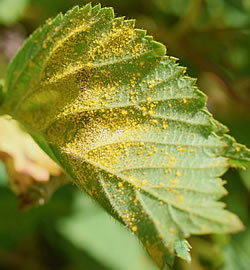 Gelb-orange Punkte auf den Blättern machen deutlich, dass die Pflanze durch den Pilz Phragmidium rubiidaei befallen ist. Ist der Befall stark, kann dies einen verfrühten Blattfall und verminderten Ertrag zur Folge haben. Eine zu dichte Pflanzung und feuchte Witterung begünstigen den Himbeerrost. Kranke Blätter sollten unverzüglich entfernt werden. Eine weitere Massnahme ist, die Pflanzen auszulichten. Eine Behandlung mit einem Fungizid (z. B. Kupfer) ist möglich, macht aber nur bei jungen noch nicht infizierten Ruten Sinn.