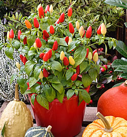 Ein fulminantes Feuerwerk leuchtender Farben bergen die Früchte dieser Pflanzen. Das Spektrum reicht von gelb, grün, orange, rot, violett bis zu weinrot. Je nach Sorte sind die Früchte rundlich, spitz oder langgezogen. Der Zierpfeffer ist zwar nicht winterhart, bleibt aber bei frostfreier Witterung bis in den Winter hinein schön. Übrigens: Die Schoten sind essbar. Je nach Sorte sind sie mild wie Peperoni oder scharf wie Chilis. Der Zierpfeffer macht sich gut allein in einem Topf oder auch in einem Kistchen oder grösseren Gefäss, zum Beispiel kombiniert mit Alpenveilchen (Cyclamen), winterharten Purpurglöckchen (Heuchera), Silberblatt (Lunaria), oder Segge (Carex).