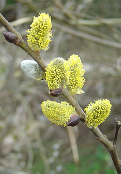 Sal-Weide (Salix caprea): Wir Menschen erfreuen uns im März/April an den dekorativen silbergrauen Weidenkätzchen der einheimischen Sal-Weide und schneiden gerne einen Strauss der Zweige zum Dekorieren. Sobald die gelben Staubfäden erscheinen, haben auch Bienen, Hummeln, Käfer und Schmetterlinge ihre Freude daran – für sie sind sie eine bedeutende Nahrungsquelle. Schön, dem regen Treiben an einer Weide zuzuschauen! Die schnell wachsende äusserst windfeste Salweide kann eine stattliche Höhe von 7 m erreichen. Sie mag einen sonnigen bis halbschattigen Platz und kommt mit jedem Boden zurecht.