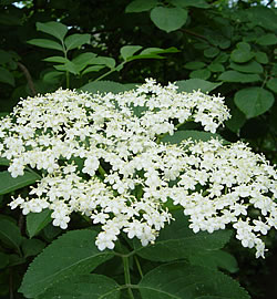 Schwarzer Holunder (Sambucus nigra): Der Schwarze Holunder ist ein robustes schnellwachsendes bis zu 5 m hoch werdendes einheimisches Wildobstgehölz, das an jedem Standort gedeiht. Blütezeit ist je nach Sorte von Juni bis Juli. Die stark duftenden crème-weissen oder rosa Blütendolden sind für Insekten (Nektar), aber auch für uns Menschen (z. B. für Sirup) von Nutzen. Der schwarze Holunder ist auch sehr gut als Kübelpflanze geeignet. Besonders dekorativ ist der farnblättrige Holunder ‘Black Lace®’ mit dem schwarzroten tief geschlitzten Laub.
