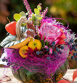 Was wäre ein Herbst ohne bunte Kürbisse – zum Essen, aber auch zum Dekorieren! Wunderschön sind Blumenarrangements direkt in die Früchte gesteckt.