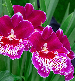 Pflege: Miltoniopsis mögen eine feuchte Umgebung. Dies gelingt, wenn sie von anderen Pflanzen, zum Beispiel Zyperngras oder Farne, umgeben sind, deren Blätter durch Verdunstung zu einer höheren Luftfeuchtigkeit beitragen. Man kann auch nachhelfen durch tägliches Besprühen (nicht auf die Blüten) mit kalkfreiem Wasser. Alle 3 – 4 Wochen einen Orchideendünger verabreichen. Im Winter und während der Blüte ist das Düngen nicht notwendig. Miltoniopsis stehen gerne in einem engen Topf. Mindestens alle 2 Jahre sollte man ihnen neues Orchideen-Substrat gönnen.