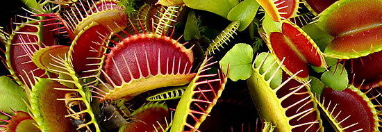 Die Venusfliegenfalle (botanisch Dionaea muscipula), auch Fliegenklappe genannt, räumt auf mit den surrenden Insekten in Küche, Bad, Wohnzimmer und Schlafzimmer. Diese sogenannt fleischfressende Pflanze hat zwei Blätter, die durch ein Gelenk klappenartig miteinander verbunden sind. Die Ränder dieser Blätter sind mit steifen Borsten ausgestattet. Die Blätter reagieren auf Berührung. Begibt sich also eine Fliege auf eine Blatthälfte, klappen die Blätter zu, und die Borsten greifen ineinander, so dass das Tier nicht mehr fliehen kann. Die Venusfliegenfalle kann Fliegen, aber auch Ameisen und sogar Spinnen verdauen, indem sie Verdauungssäfte produziert, die ihre Beute langsam auflöst. Übrig bleiben nur noch harte Teile der Körperhülle.