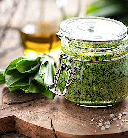 Schon fast ein Muss für Bärlauch Fans ist Bärlauch-Pesto: Pinienkerne, Olivenöl, Parmesan, Bärlauch, Salz und Pfeffer mixen – und fertig ist die feine Zugabe zu Pasta. Für ein lange haltbares Pesto kann man einen Bund Bärlauch mit ca. 1 dl Oliven- oder Rapsöl und 2 – 3 TL Salz pürieren. In Gläser abgefüllt und dunkel gelagert, hält er bis zu 1 Jahr.