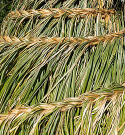- Zusammenbinden: Grosse sommergrüne Gräser wie Chinaschilf und Pampasgras bindet man an einem sonnigen, trockenen Tag gut zusammen. So kann Regenwasser ideal abfliessen, und der Schnee kann die Halme nicht auseinanderdrücken. Man kann die Halme auch zu einem Zopf flechten, was sehr dekorativ aussieht. Die ideale Zeit dafür ist im Spätherbst oder im frühen Winter, bevor der Boden gefriert. Das Zusammenbinden gilt jedoch nicht für kleinere und immergrüne Gräser wie Segge oder Hainsimse. Zusammengebunden würden diese schnell faulen.