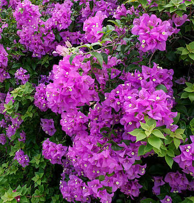 Die Gattung der Bougainvillea wurde nach dem Franzosen Louis Antoine de Bougainville benannt, der 1766 die Pflanzen auf einer Erdumsegelung entdeckte. Es gibt innerhalb dieser Gattung etwa 14 verschiedene strauchartige bis meist kletternde Arten. Neben dem lateinischen hört man oft den deutschen Namen Drillingsblume. Er stammt von der Anordnung der eigentlichen Blüten, die in Dreiergruppen zusammenstehen. Bougainvilleen kennen die meisten Menschen von den Ferien im Mittelmeerraum, wo sie manchmal ganze Hausfassaden zieren.
