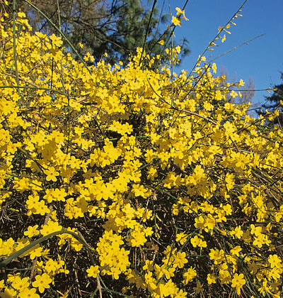 Sehr zahlreiche leuchtend gelbe Blütensterne, ähnlich einer Forsythie.