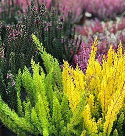 Die Zeiten, in denen Heidepflanzen – üblich waren früher rosafarbene Besenheide (Calluna vulgaris) und rote Glockenheide (Erica gracilis) – lediglich eine nette Beigabe zu Herbstblumen wie Chrysanthemen, Alpenveilchen, Astern oder Stiefmütterchen waren, sind längst vorbei. Inzwischen haben Heidepflanzen durch ihre Farben- und Formenvielfalt durchaus das Zeug zu Hauptdarstellern. Und das Gute: Alle, ausser die Glockenheide (Erica gracilis), sind winterhart.